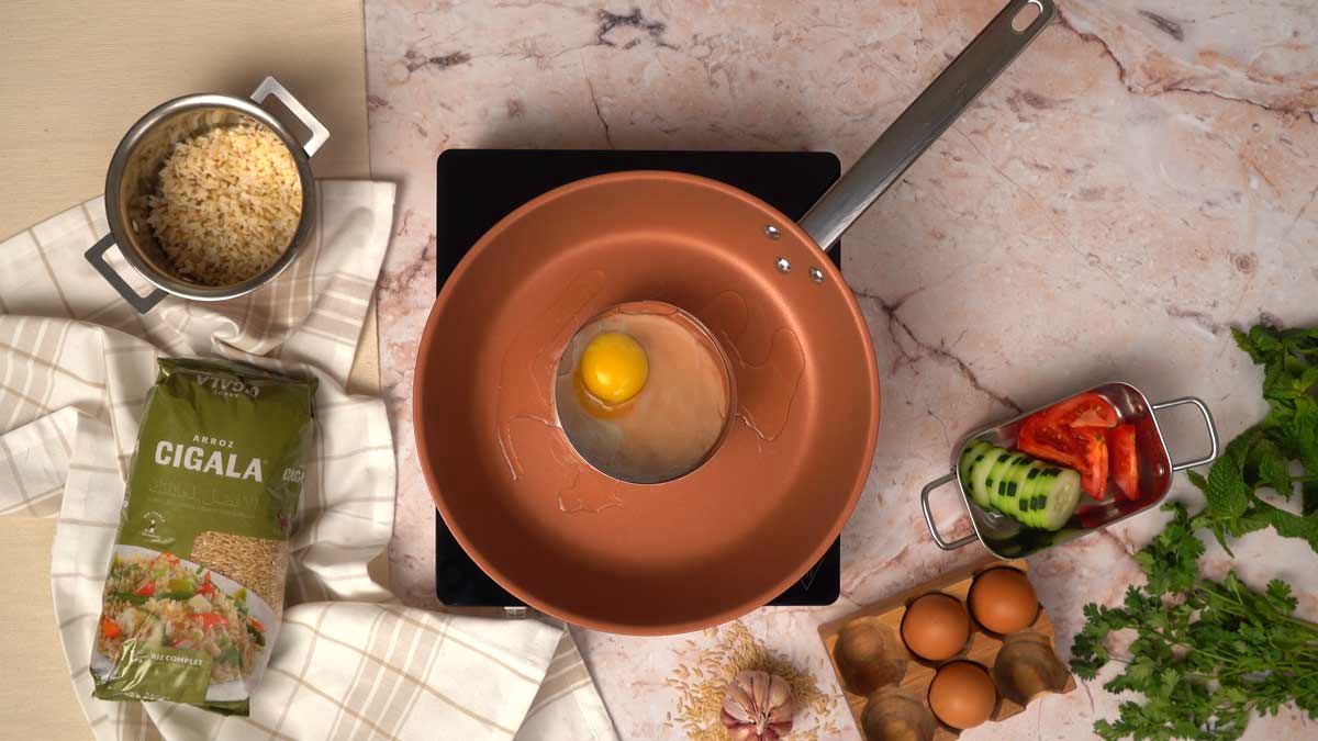 في مقلاة، نطبخ البيضة، نحاول أن نحصل على بيضة دائرية دون ثقب الأصفر