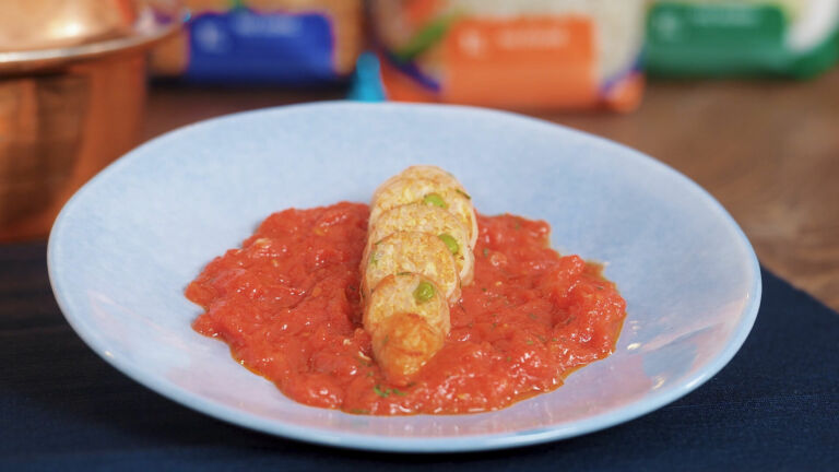 Pour préparer la sauce, dans la même poêle de cuisson que les oignons, ajouter les tomates râpées et l’ail haché, puis laisser bien cuire.
