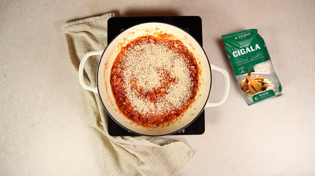 Dans la même poêle, cuire l’oignon et le poivron rouge, jusqu’à ce qu’ils soient dorés. Ajouter une cuillère à café de paprika douce, la chaire du piment séché, un peu de safran et deux tomates râpées. Bien mélanger.