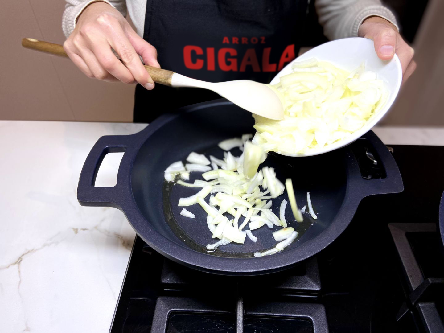 Dans une poêle à part, faire revenir l’oignon dans l’huile d’olive. Il est recommandé de couper l’oignon très fin, mais nous pouvons également laisser des morceaux plus grands, selon le goût de chacun.