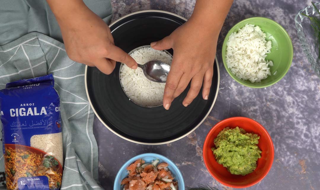 Dresser le riz comme première couche à l’aide d’un emporte-pièce, puis ajouter une couche d’avocat bien étalée et enfin le saumon.